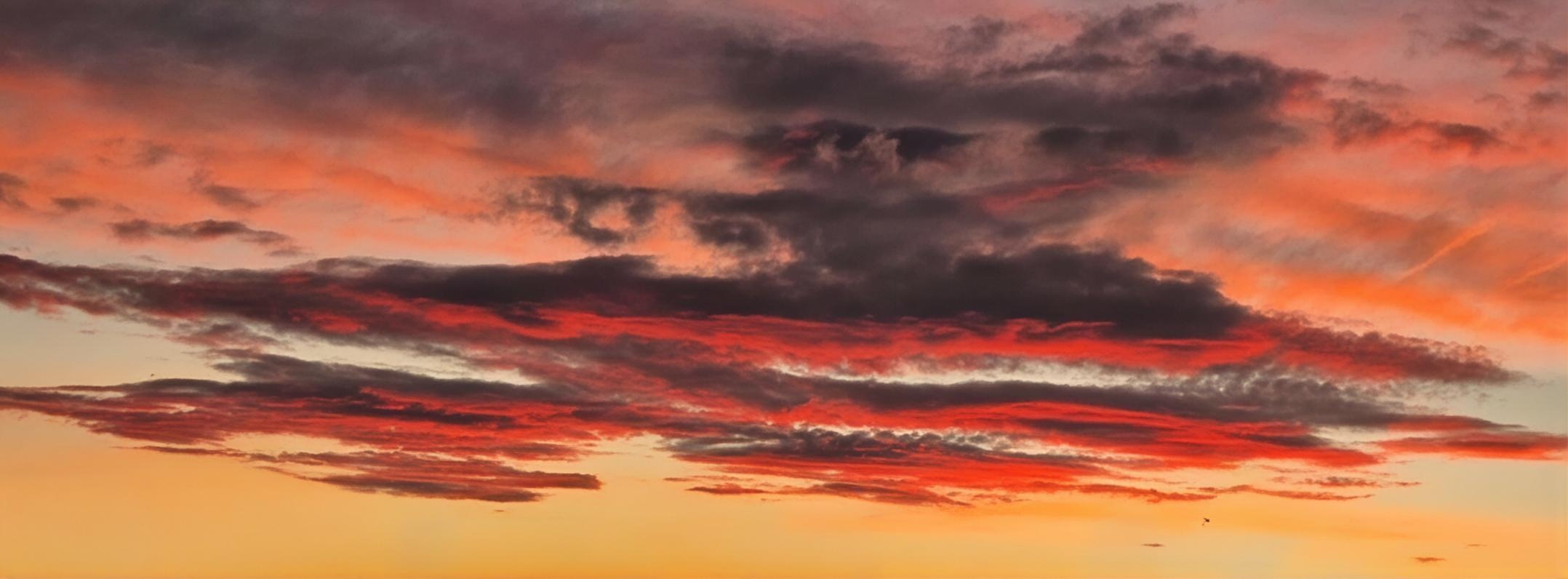 Nubes oscuras se desgarran en el firmamento revelando vetas de rojo incandescente, como si el cielo sangrara luz en su despedida del día. Las formaciones horizontales crean capas dramáticas donde el gris plomizo contrasta violentamente con el carmesí ardiente y el naranja fundido. Un paisaje celestial de belleza apocalíptica donde las sombras y el fuego libran su última batalla, dejando cicatrices luminosas que atraviesan el horizonte como heridas abiertas en el manto del atardecer.