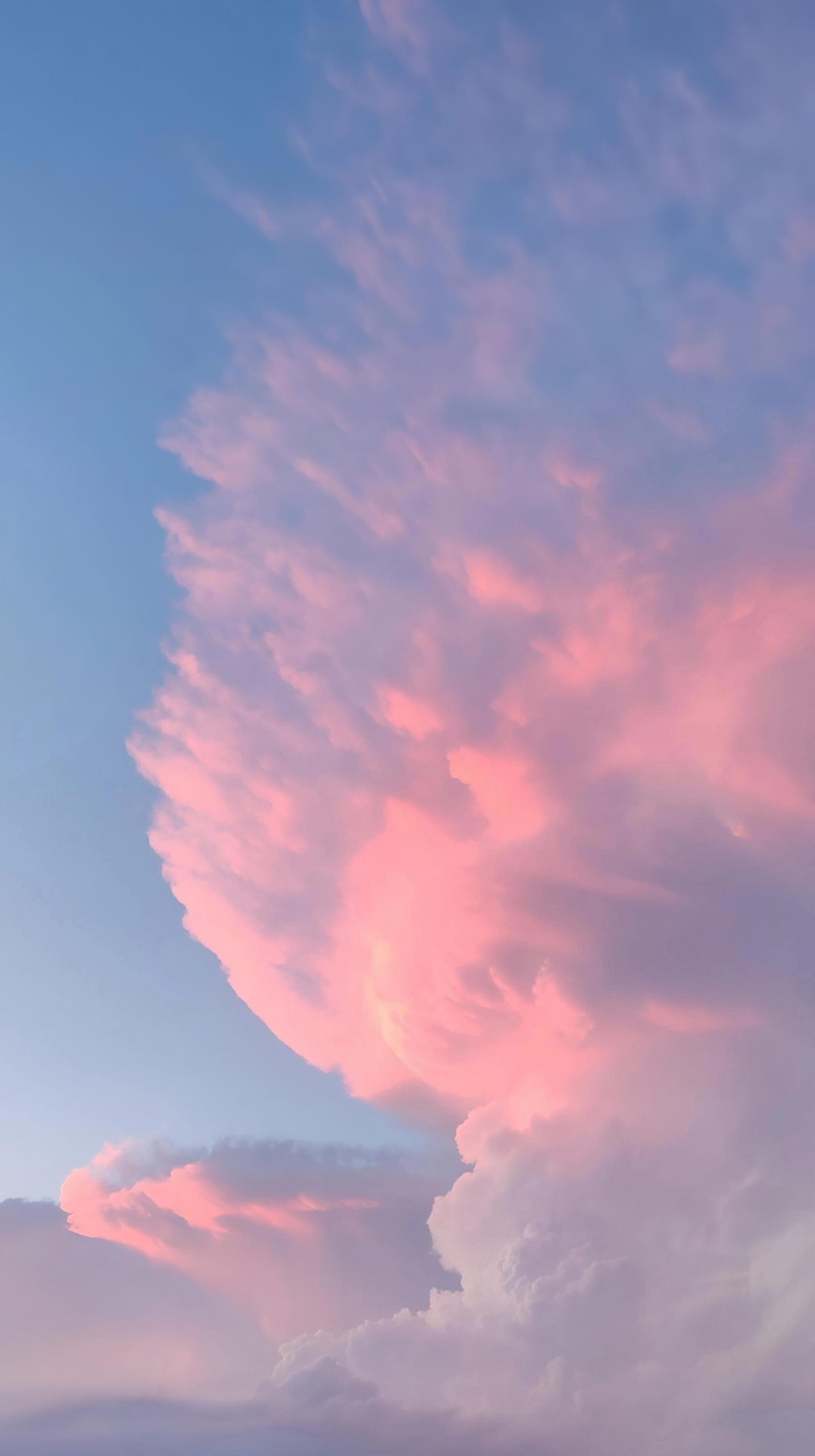 Una nube colosal se alza verticalmente como un titán de algodón teñido de rosa, dominando el cielo crepuscular con su presencia imponente y majestuosa. Sus volúmenes esponjosos se apilan en capas dramáticas, capturando la luz del atardecer en tonos que van del rosa intenso al lavanda suave. Una torre celestial que parece crecer sin límites, desafiando la gravedad mientras se eleva hacia el infinito, poderosa y delicada a la vez, como un castillo de ensueño construido con nubes y luz.
