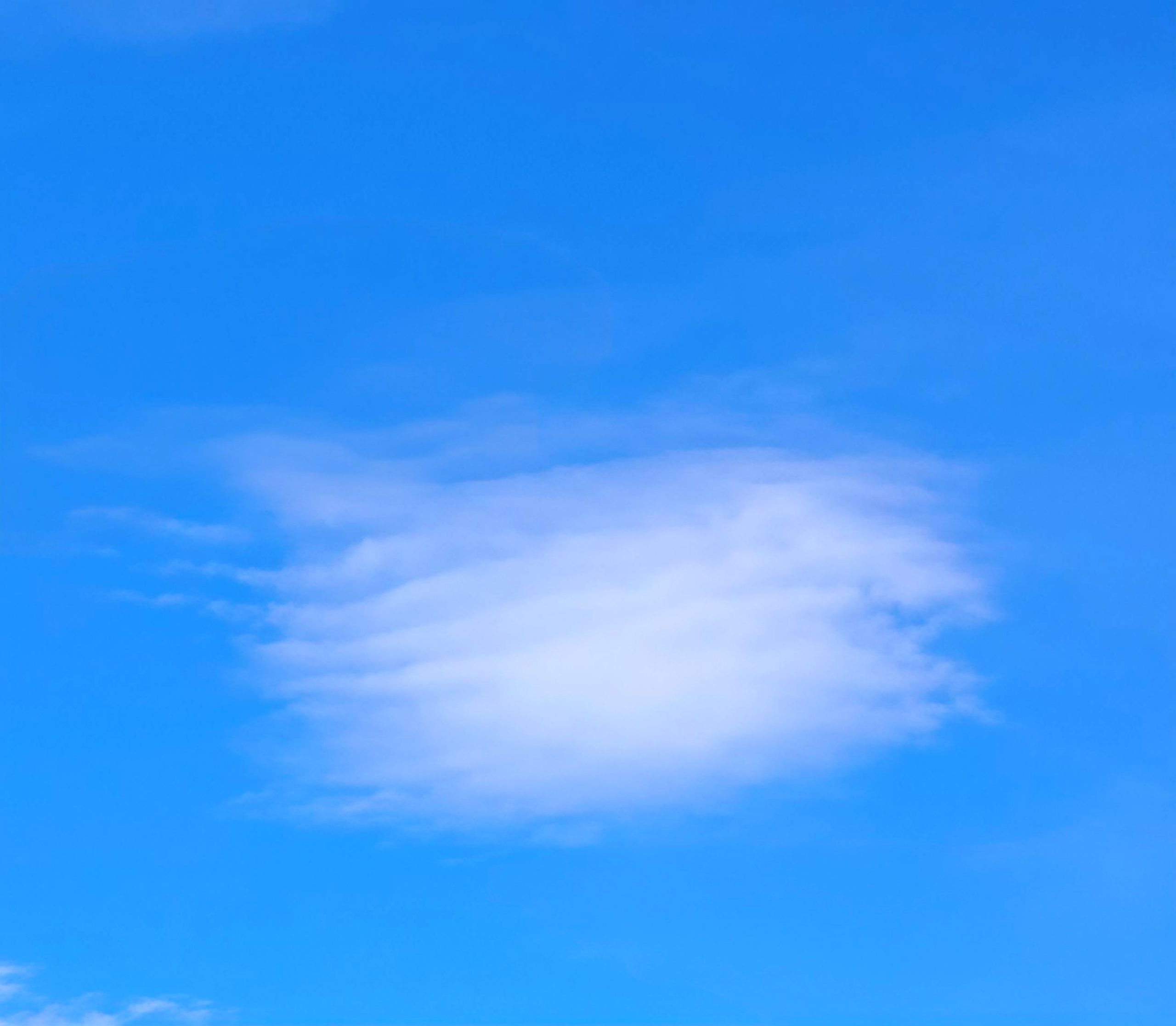 Una nube difusa flota en el azul intenso como la huella que dejó un ángel al rozar el cielo con sus alas, con su forma etérea que apenas se percibe creando una marca translúcida de su paso celestial. Sus bordes indefinidos se funden con el azul circundante como si fuera la impresión de plumas de vapor sobre el firmamento, mientras su blancura tenue parece el rastro de algo divino que voló y ya se fue. Una señal celestial suspendida en la inmensidad, tan delicada que parece la prueba de que los ángeles existen pero prefieren no ser vistos del todo, recordándonos que a veces lo sagrado deja huellas tan sutiles que solo quienes miran con atención pueden descubrirlas flotando en el azul infinito.