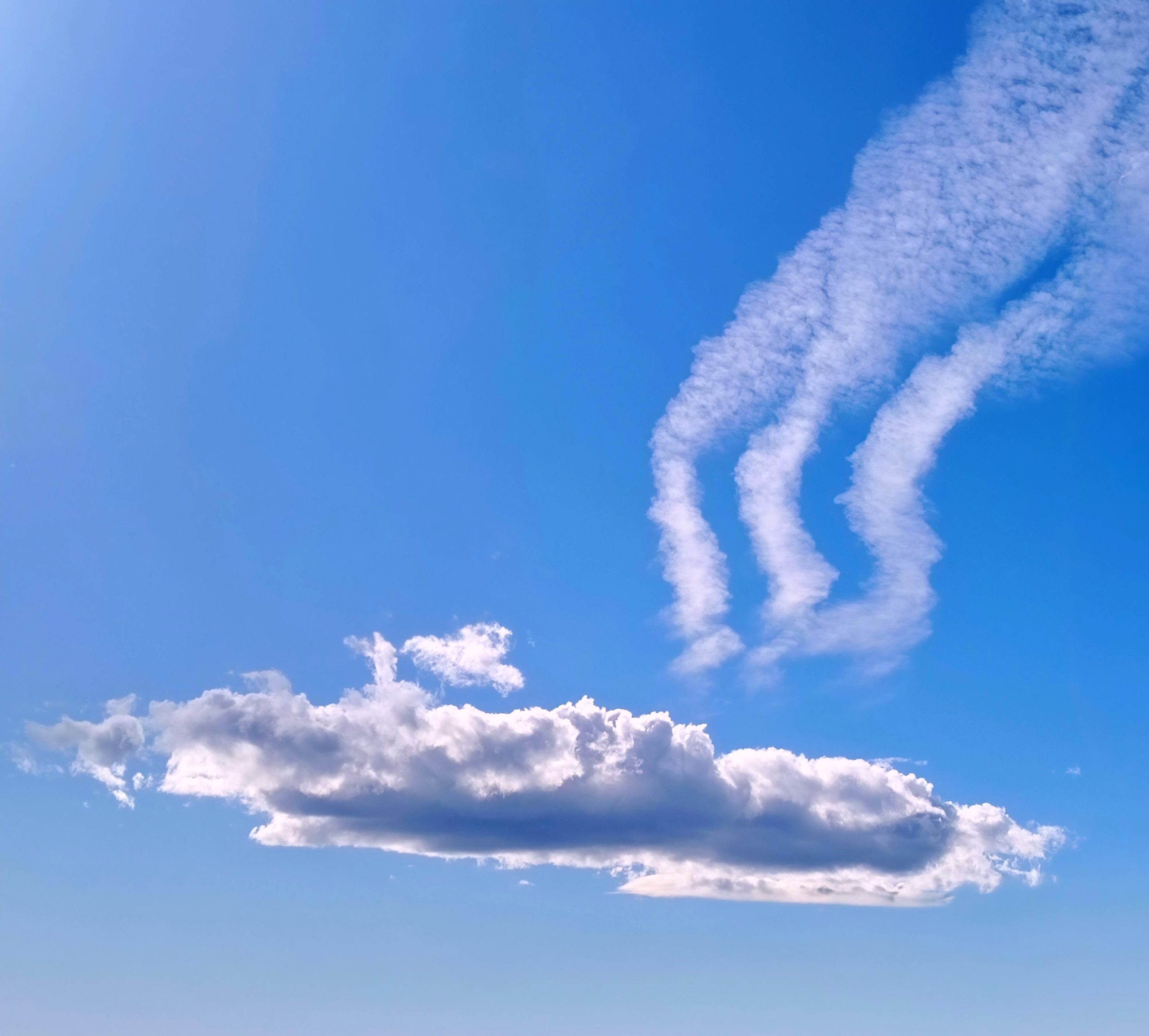 Una nube horizontal reposa en el azul degradado mientras tres estelas curvas descienden desde lo alto como cintas de humo celestial. La composición crea un diálogo visual entre lo estático y lo dinámico, entre la calma de la nube y el movimiento ondulante de las estelas. Un ballet aéreo donde el vapor traza coreografías efímeras, capturando el instante preciso en que el cielo se convierte en lienzo de formas imposibles.