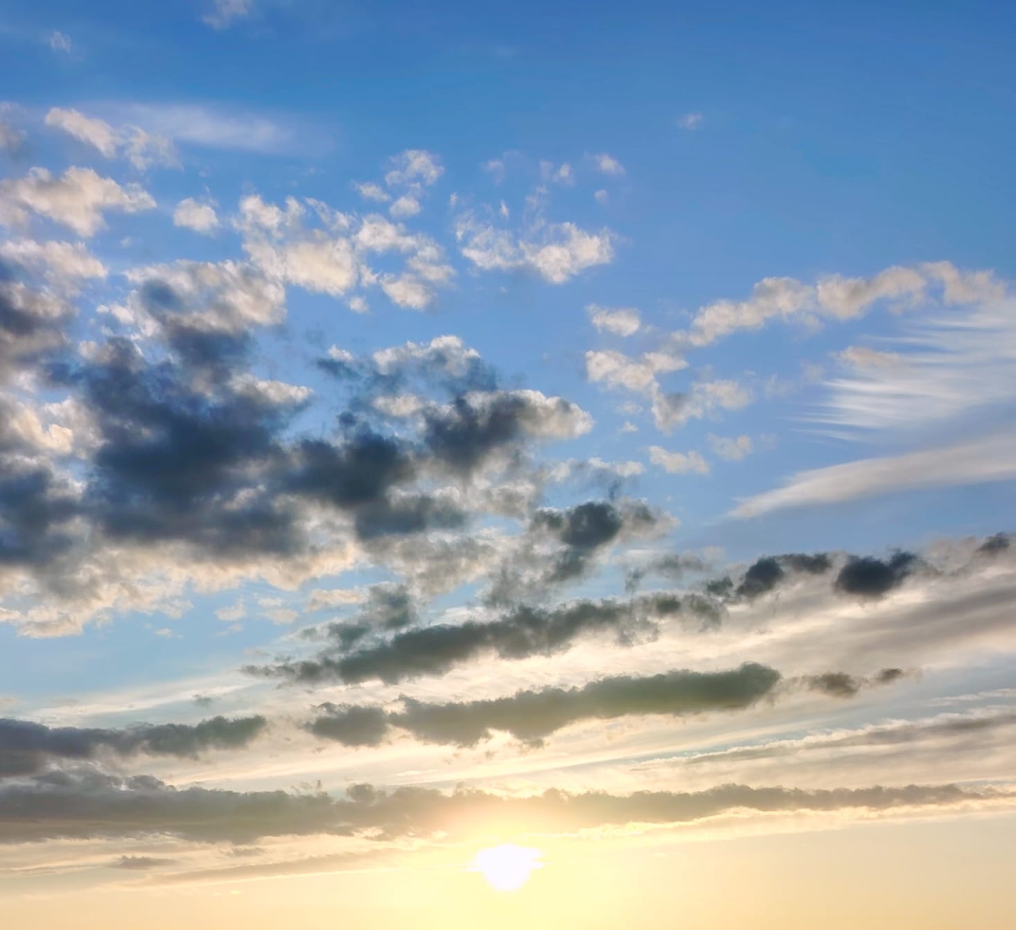 Nubes estratificadas se despliegan en el cielo como cortinas de un teatro cósmico que se abren y cierran entre el día y la noche, con sus capas horizontales teñidas de ámbar, plata y carbón creando un portal entre dos mundos. Sus formas se apilan en el firmamento como peldaños de una escalera que desciende desde el azul hacia el oro incandescente del horizonte, mientras la luz agonizante transforma cada estrato en un velo translúcido. Un pasaje dimensional suspendido en la inmensidad, donde el tiempo se detiene y el cielo revela su naturaleza dual, invitándonos a cruzar ese umbral efímero donde lo diurno besa a lo nocturno.