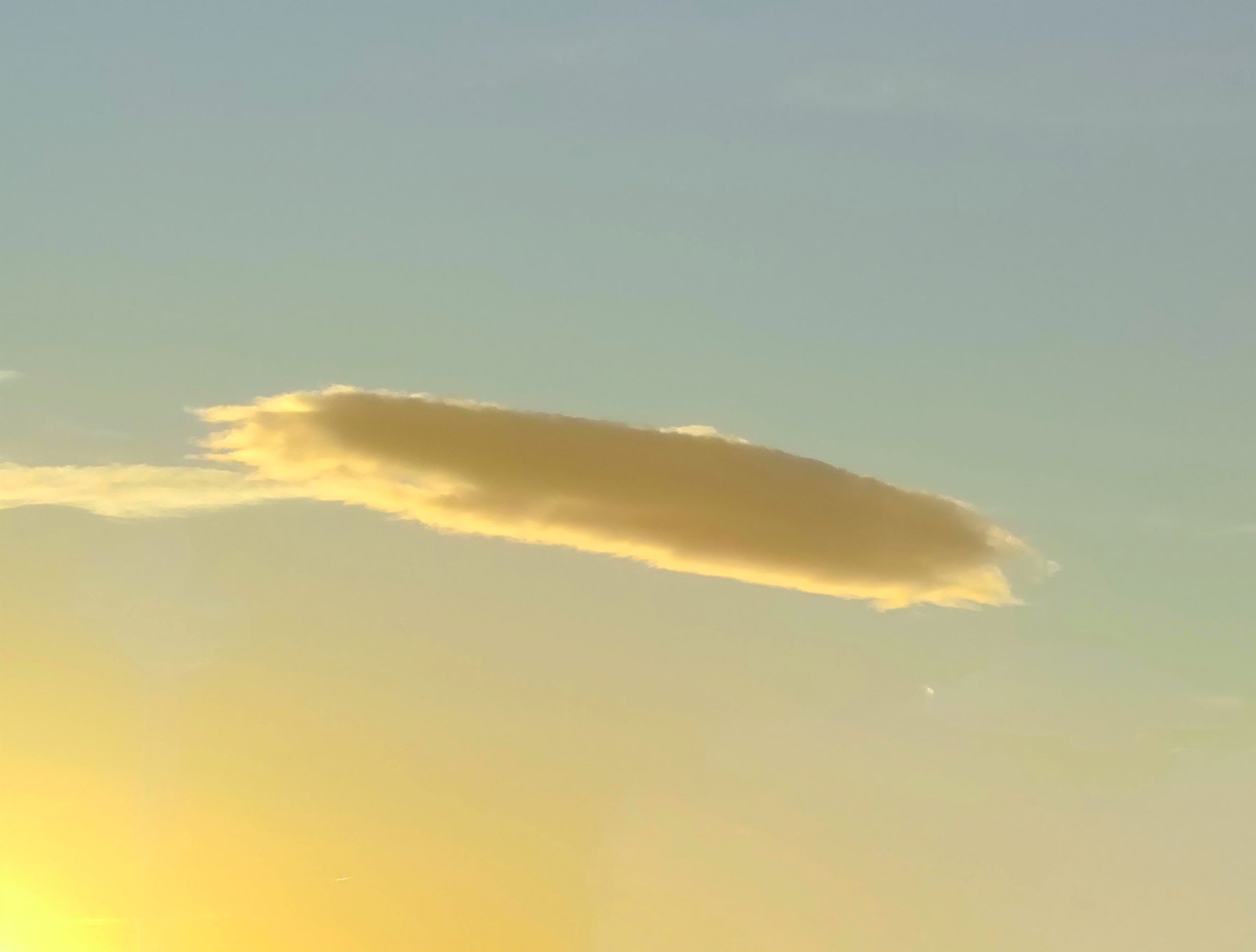 Una nube alargada y elegante flota suspendida en el cielo del atardecer, bañada en tonos dorados y ámbar. Como una pluma celestial dibujada por el viento, su silueta suave contrasta con el degradado de luz que la envuelve. Un instante mágico donde el cielo se convierte en lienzo y la nube en obra de arte efímera.
