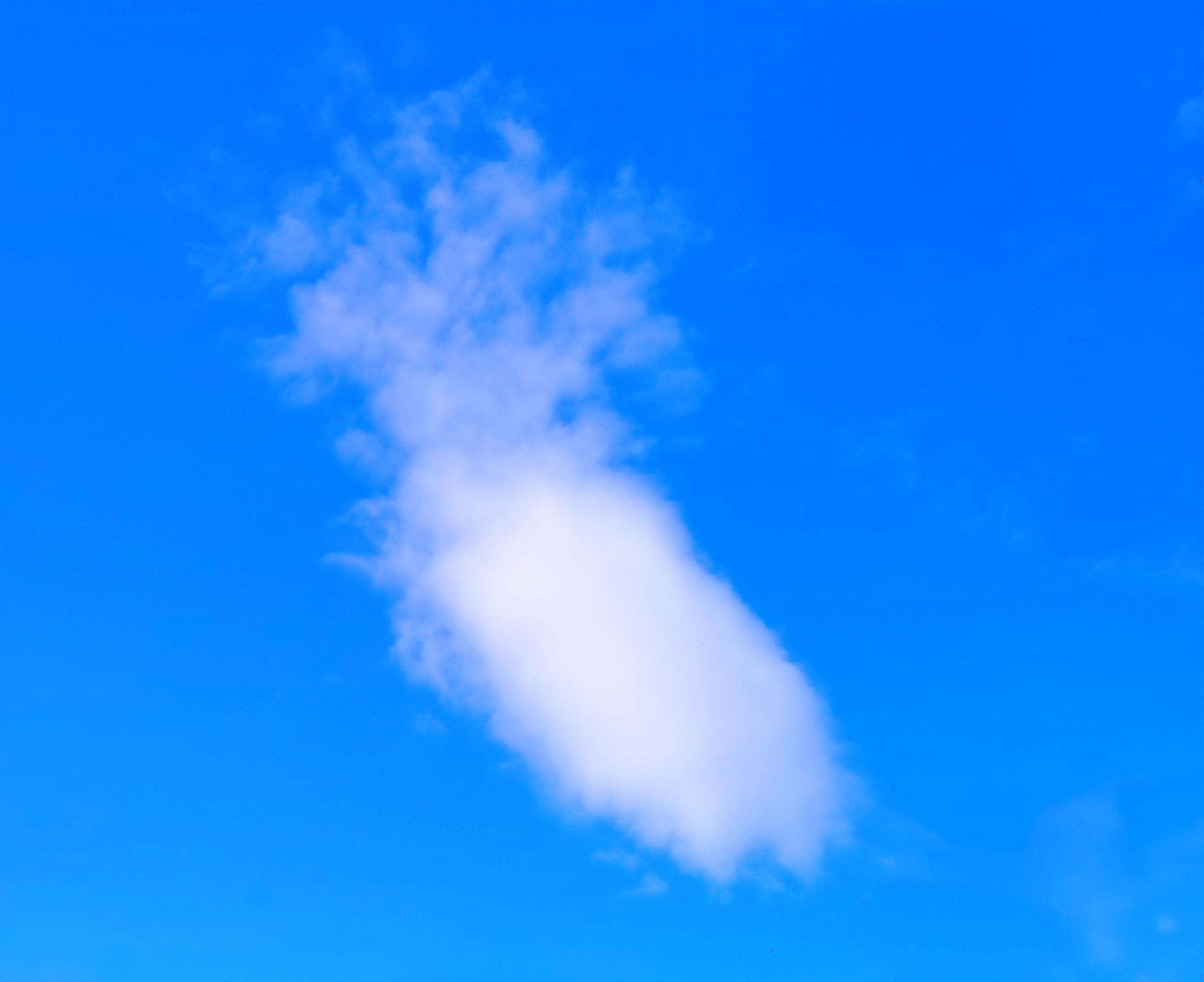 Una nube vertical se eleva como una columna de vapor etéreo, difusa y translúcida contra el azul radiante. Sus bordes se deshacen suavemente en el aire, creando una forma fantasmal que parece ascender hacia el infinito. Un suspiro celestial capturado en movimiento, ligero como el humo, puro como un sueño.
