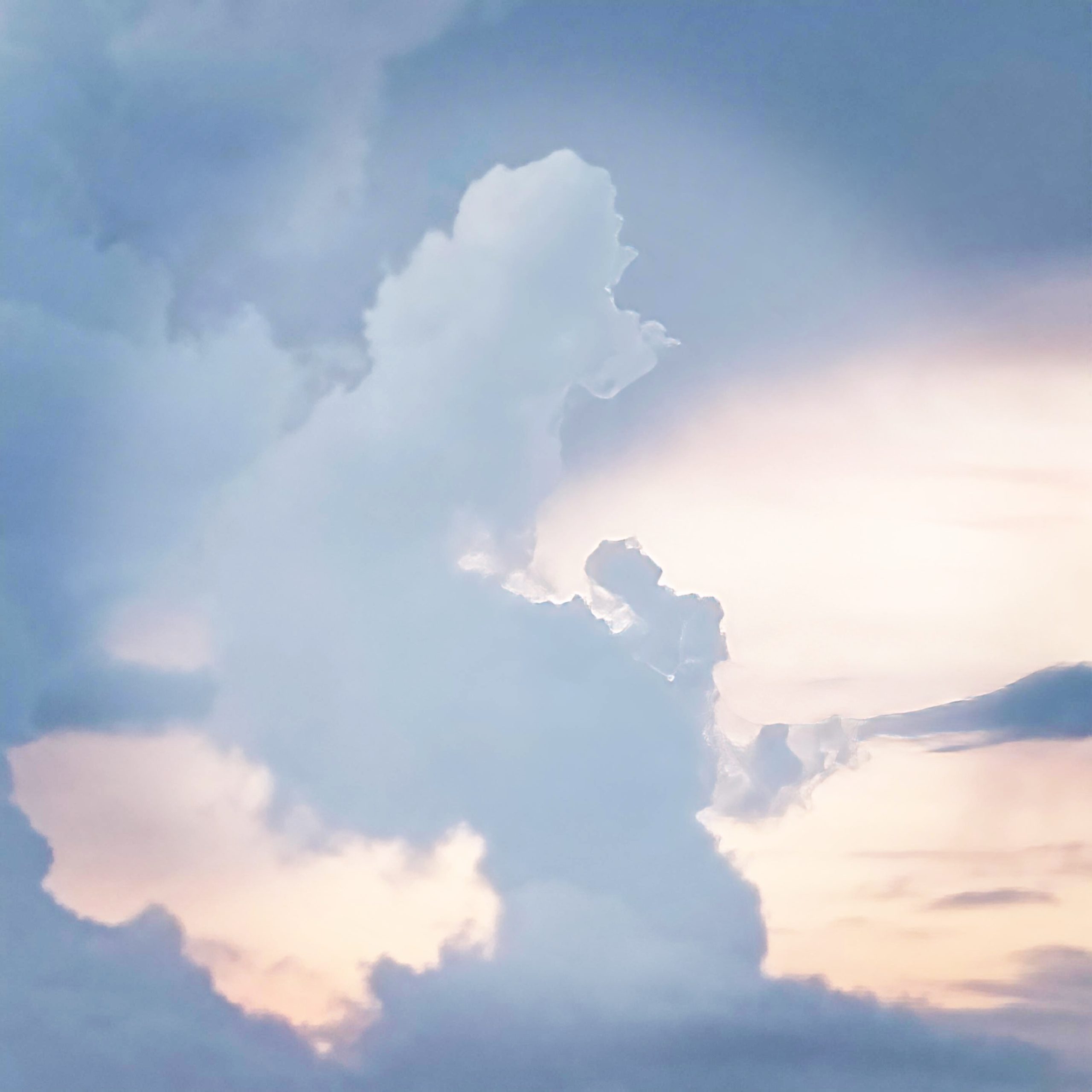 Una nube titánica se yergue en el horizonte como un coloso ancestral despertando del sueño eterno, sus formas verticales y poderosas dominan el cielo con presencia imponente. Bañada por la luz moribunda del atardecer, su silueta se recorta contra tonos de azul acero y melocotón, creando un contraste dramático entre sombra y resplandor. Un gigante silencioso que observa el mundo desde su trono de aire, testigo inmutable del paso del día a la noche, guardián efímero del umbral entre dos mundos.